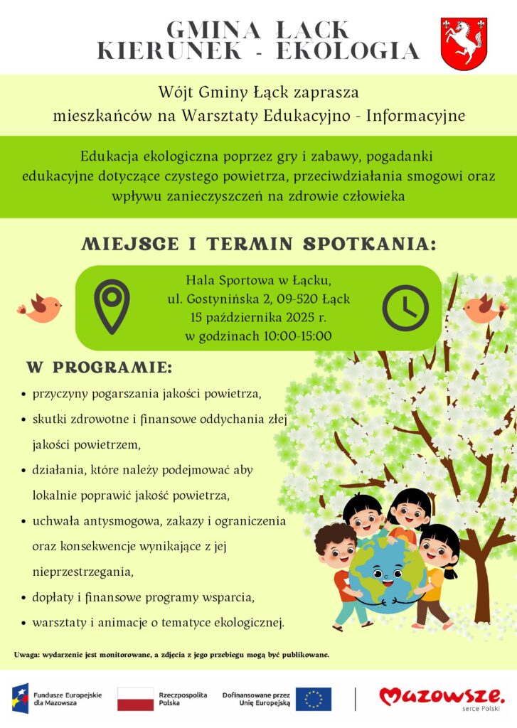 Gmina Łąck zaprasza mieszkańców do udziału w projekcie „Mazowsze bez smogu”, współfinansowanym przez Unię Europejską w ramach Programu Fundusze Europejskie dla Mazowsza 2021–2027.