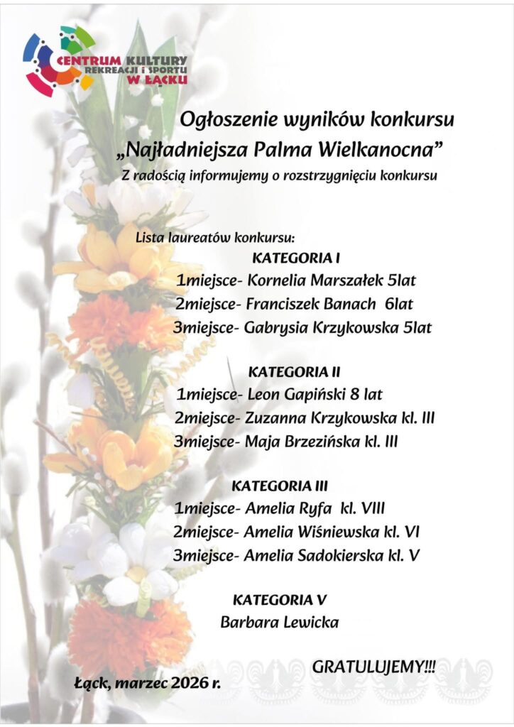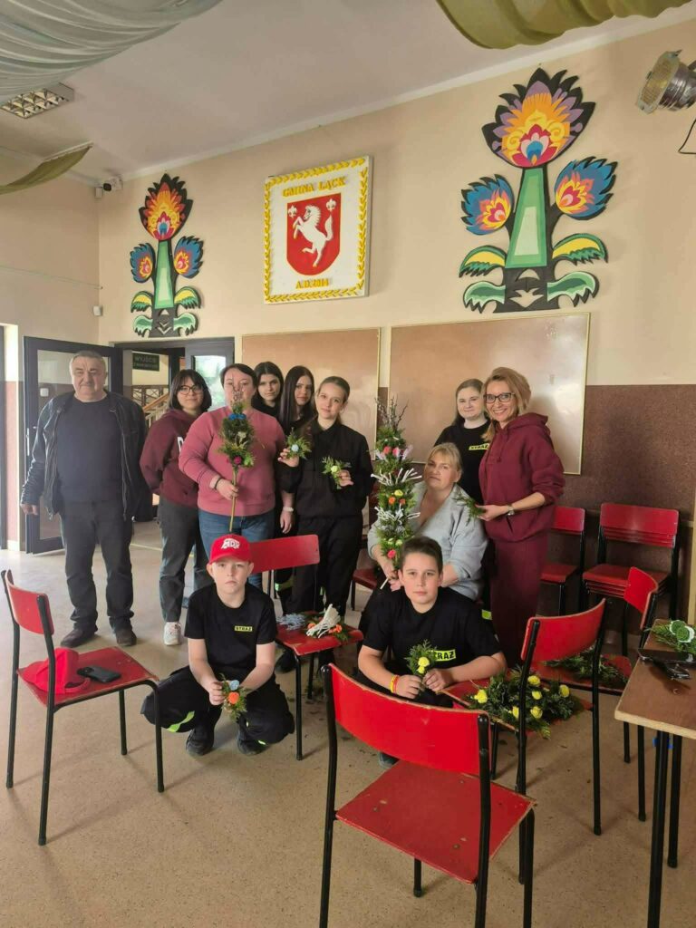 Z okazji Niedzieli Palmowej Młodzieżowa Drużyna Pożarnicza z OSP KSRG ŁĄCK przygotowała palmę oraz dzieci z Centrum Kultury, Rekreacji i Sportu w Łącku w ramach Konkursu także przygotowały palmy.